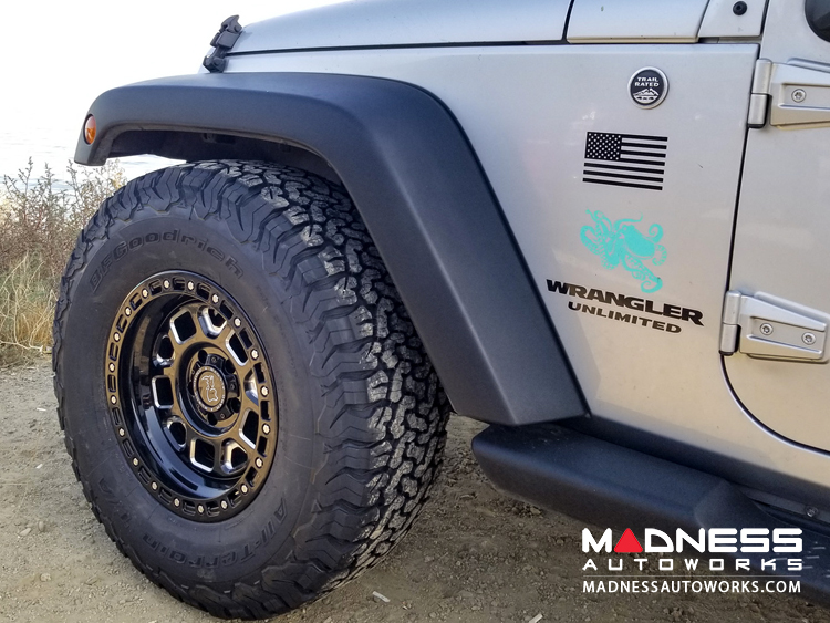 A gallant race truck inspired five-spoke features bold rectangles painted Gloss Black and is then CNC milled presenting a Braun and brassy statement. The Alpine features a deep step lip designed and precisely measured around some of the truck markets’ biggest brakes to guarantee fitment. Finishing off the wheel is a tough simulated bead lock with silver hex bolts and functional drain holes to prevent water and dirt from being trapped in the wheel. This is form and function wheel that is built with the valve stem guarded within the bead lock lip as well.