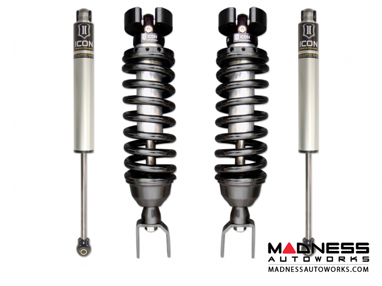 The Stage 1 system includes vehicle-specific tuned 2.5” coil-over shocks featuring an internal reservoir for exceptional cooling properties and ICON-engineered Eibach coil springs for superior vehicle “feel” through the range of travel. These coil-overs are also height adjustable from 0-3” allowing the use of larger, more aggressive wheel and tire combinations. ICON 2.0 Aluminum Series monotube rear shocks utilize a vehicle-specific valving that balances the performance of the truck from front to rear.