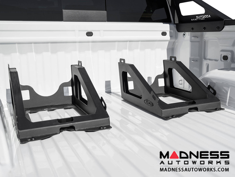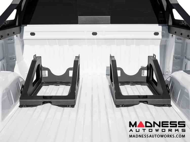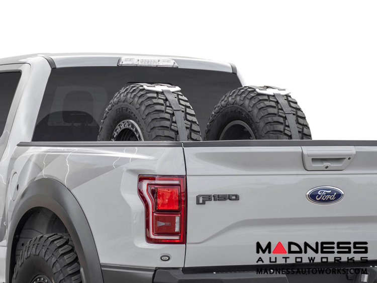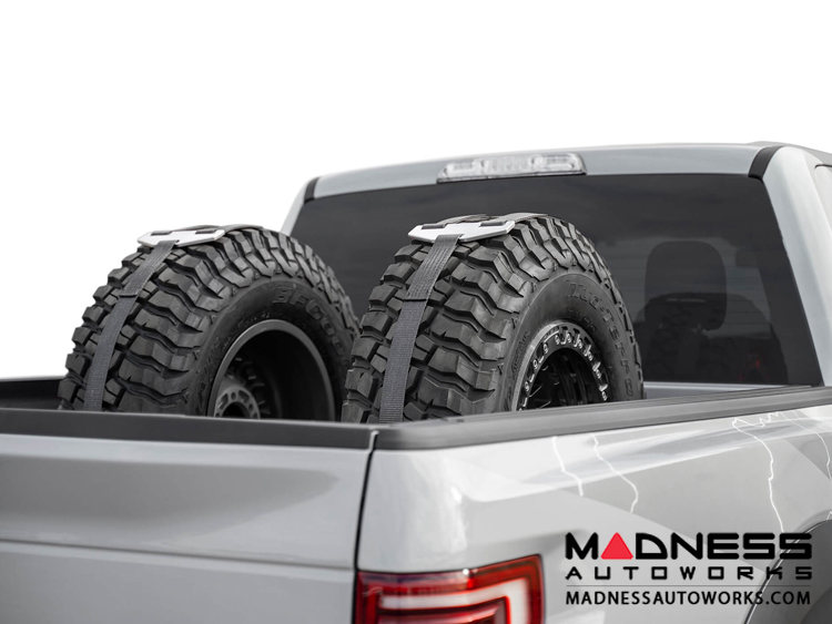 Slots cut into the front and back of the carrier support a Y-strap to hold your spare tires in place. The series of mounting holes allow you to mount the tire carrier anywhere in your truck bed. Run the tire carrier individually or side-by-side to carry a single or pair of spares to meet your needs.