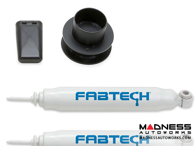 From the factory, Dodge incorporated coil springs with a large bow for increased vehicle stability. Because of this feature, flat spacers won't do you much justice. Fabtech’s angled spacers retain this important feature preserving the factory ride characteristics. Replaced with longer length shocks, you will allow for full suspension travel while improving the damping of the front suspension. Included in this system are extended length bump stops to prevent the coil springs from binding at full compression.