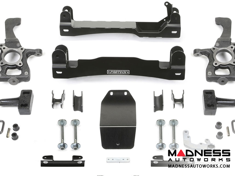 Fabtech’s new 4” F150 system allows the use of 35” tall tires and feature high arched lower control arm cross members constructed of 1/4 “ thick steel for maximum strength. The Fabtech iron steering knuckles retain the stock track width allowing the tires to stay fitted under the fender for a clean finished look. The rear lift is accomplished with a block and u bolt configuration.