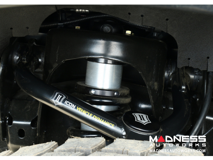 This system features upper control arms with this patent pending Delta Joint. The Delta Joint is a heavy duty high angle ball joint that combines the durability of a ball joint with the performance characteristics of a traditional uni ball. While the industry standard uniball does a great job of allowing the control arms of a vehicle to articulate with little bind, they do have an inherent weakness that leaves more to be desired when used in a daily driven application - exposure to the elements. The Delta Joint features a zinc plated housing providing the first layer of corrosion resistance, while a tough grease seal keeps potentially harmful elements out of the inner workings of the joint. Metal on metal construction and a greasable design increase the longevity of the Delta Joint while at the same time allowing for noise-free operation. What makes the Delta Joint unique is that it brings the best of both worlds to ICON upper control arms with features that make it more robust than a uni ball, and at the same time capable of greater angularity than a typical ball joint.