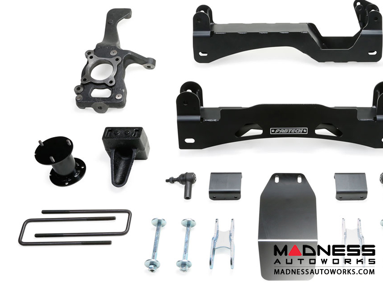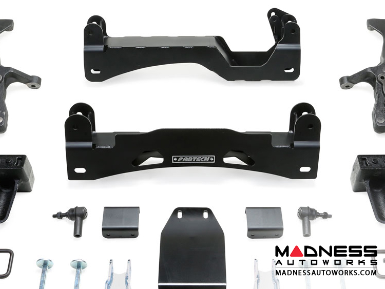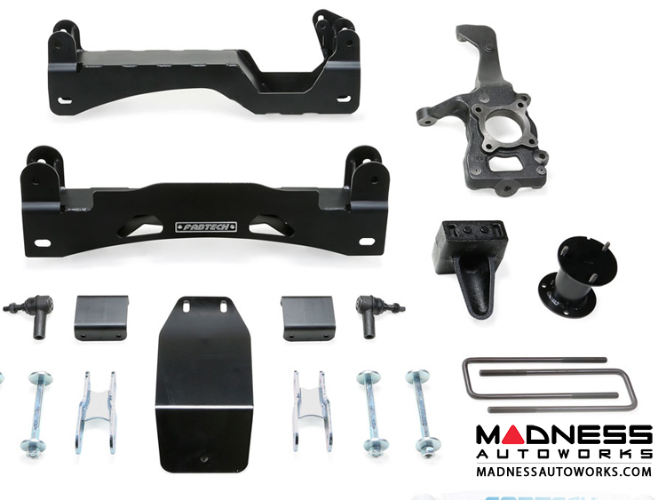 Fabtech’s new 6” F150 system allows the use of 37” tall tires and feature high arched lower control arm cross members constructed of 1/4 “ thick steel for maximum strength. The Fabtech iron steering knuckles retain the stock track width allowing the tires to stay fitted under the fender for a clean finished look. The rear lift is accomplished with a block and u bolt configuration. The iron steering knuckles in this kit allow use of 18”, 20” or 22” wheels.