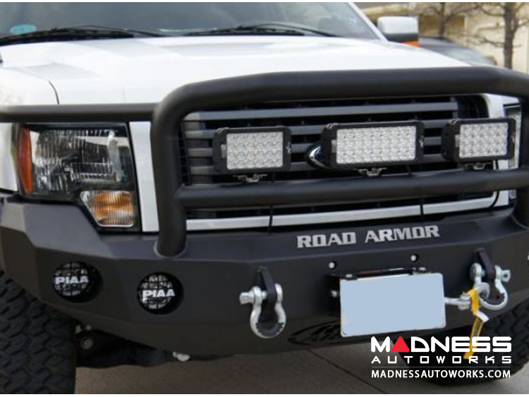 Ideal Illumination. Not only does the Stealth winch front bumper come with an effective winch mount, but it also features round recessed light ports that easily secure 4 four-inch PIAA 510 or Quake LED QFR199 lights. The bumper's Lonestar Guard also features 3 light tabs that provide additional mounting for auxiliary lights that will illuminate the dark path ahead. The lights themselves are not included.