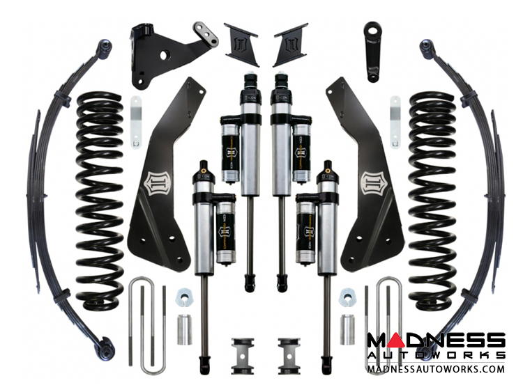 Increasing wheel travel and ride comfort is standard operating procedure, but our engineers aimed high to produce a suspension solution that also maintained the Super Duty’s towing capacity. The 7” Suspension System for the 2011+ Super Duty yields enough lift to clear 37” tires while providing excellent ride characteristics across a wide variety of terrain on and off-road. Each component of this suspension system has been specifically engineered to work in union with other ICON parts to extract maximum performance out of the vehicle. This Stage 4 System is comprised of 7” lift dual rate coil springs, fabricated radius arm drop mounts with brushed stainless badges, track bar drop bracket, bump stop extensions, sway bar links, a forged pitman arm, brake line brackets, rear 5″ lift progressive rate leaf springs w/ u-bolts, and 2.5 Series piggyback reservoir front & rear shocks. The 2.5″ reservoir shocks ensure optimum performance by increasing the duration of consistent damping regardless of situation, keeping the shocks at a cooler operating temperature during heavy use.