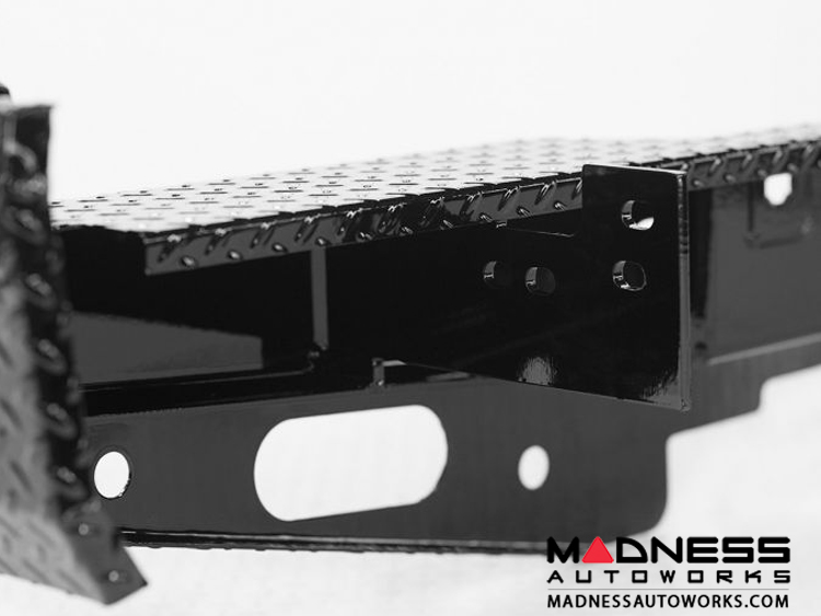 Sport Series Full Width Black Powder Coat Rear HD Bumper by Ranch Hand®. With Lights. With Sensor Holes. Built with formed channel and diamond-plate steel, the Sport Back Bumper is the companion back bumper to the Summit and Sport Front Bumpers offering a lighter weight alternative to the Legend Series.