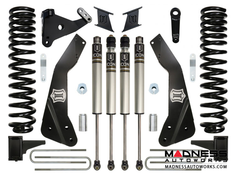 The Suspension System for the 2011+ Super Duty yields enough lift to clear 37” tires while providing excellent ride characteristics across a wide variety of terrain on and off-road. Each component of this suspension system has been specifically engineered to work in union with other ICON parts to extract maximum performance out of the vehicle. Our Stage 1 System is comprised of 7” lift dual rate coil springs, fabricated radius arm drop mounts with brushed stainless badges, track bar drop bracket, bump stop extensions, sway bar links, a forged pitman arm, brake line brackets, rear 6" lift blocks with u-bolts, and 2.0 Aluminum Series smooth body front & rear shocks.