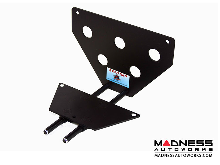 The STO N SHO is a two piece detachable front license plate mounting system consisting of a front license plate holder and a base mounting plate that allows for the easy removal of the front license plate when desired and the quick replacement of the front license plate when needed. When the front license plate holder is removed the remaining base plate is virtually undetectable. The STO N SHO allows you to comply with state law while maintaining the beauty of your Mustang.