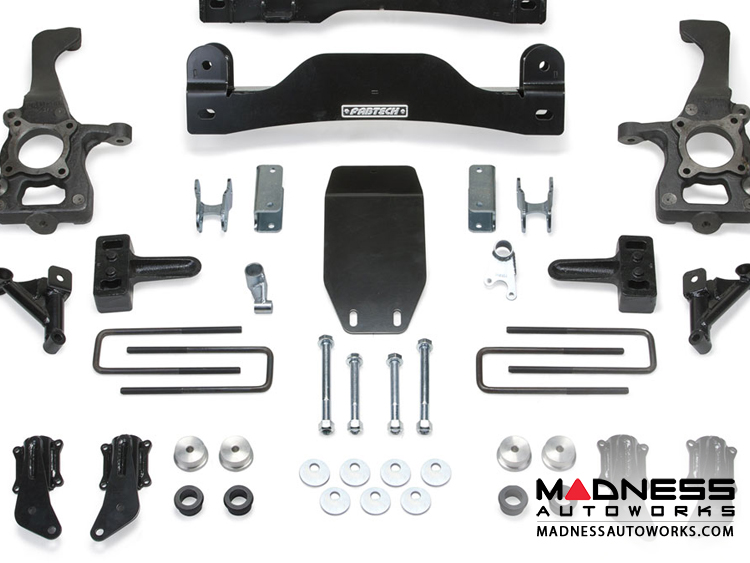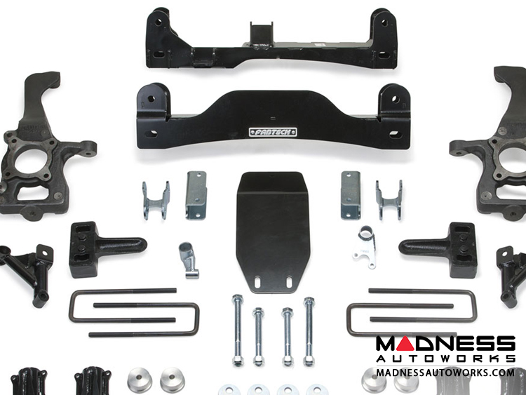 This 4” System for the Ford SVT Raptor allows for increased suspension height while retain retaining the factory SVT control arms and Fox Shocks. Fabtech engineered heavy duty iron steering knuckles that are made to handle 37” tall tires that are entirely compatible with the Raptor's electronic stability control and traction control. The Raptor SVT control arms must be relocated as with any cross member kit, but with 1/4” thick steel Cross Members designed specifically for the Raptor, they retain the travel features of the vehicle for off road use. As the Raptor has Fox Suspension already, Fabtech made this kit so that the suspension can be re-used with the addition of front and rear shock extensions. CV angles are able to maintain correct angles at the elevated ride height as the front differential is relocated and comes with a 1/4“ thick steel skid plate for extra protection.