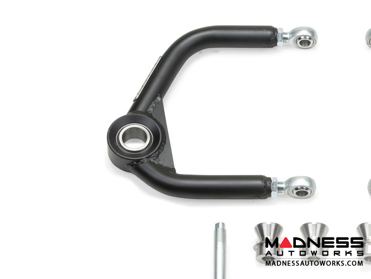 These Fabtech direct replacement Upper Control Arms will provide additional strength and reliability for aggressive offroad driving in your Ford Raptor. These replace the factory upper ball joints with a 1.50" ID Stainless American Uniball. Additional caster is built into the arms for greater alignment capabilities to help with leveling kit alignment.