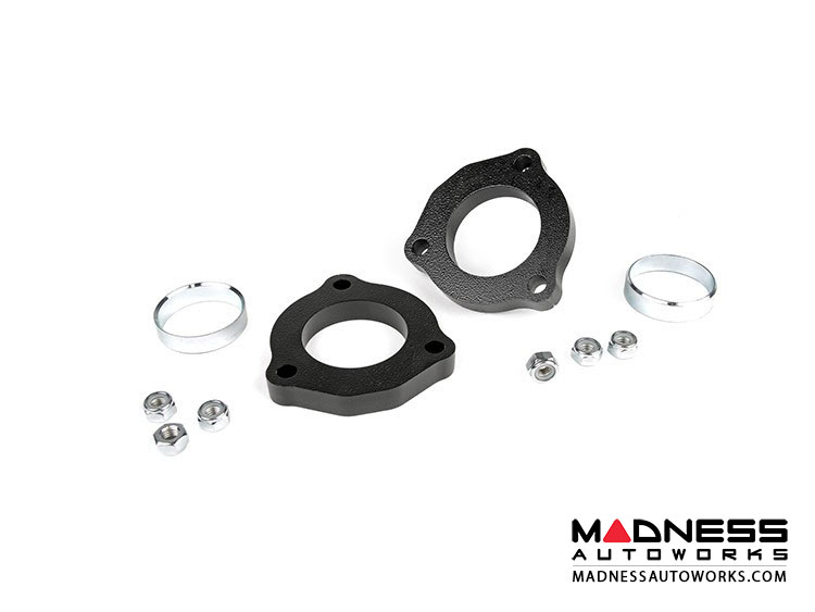 Gain a perfectly level look from front to rear, eliminating the factory rake, with this easy-to-install leveling kit! Give your truck plenty of ride-height to run up to a 265/70/17 tire on factory wheels with our innovative spacer setup. This kit uses our durable upper strut spacer along with a pre-load spacer, offering lifted height without sacrificing ride quality or looks. Though strut disassembly is necessary, this kit features a 100% bolt-on installation procedure with no cutting or drilling required, and can be easily returned to stock at any time! Rough Country's 2015 Chevrolet Colorado and GMC Canyon 2-inch Leveling Kit comes backed by our Lifetime Replacement Guarantee and Warranty Guard Protection.