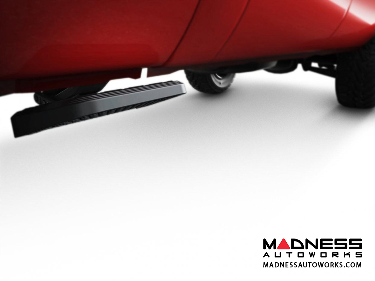 AMP Research BedStep box side steps are American-made quality! These steps retract as easily and quietly as the extend down. Made from high strength aluminum alloys and precision stainless steel pivot pins, they can support up to 300 lbs. They securely mount to your truck frame under the bumper or box so you can use them with an open tailgate or when towing. They are maintenance-free with self-lubricating bushings and feature a military-spec, corrosion-resistant, anodized and Teflon® coated finish for great all-weather performance. Although Telfon coated, the BedSteps are lined with non-slip composite step pads that are large enough for two large boots!