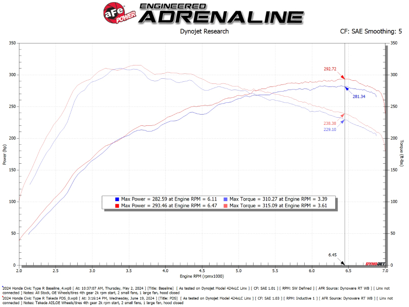 Momentum’s unique filter-to-housing interface was built to feature the largest air filter possible. This 9” tall 360-degree radial flow air filter features a 3.5" flange and our oil-free Pro DRY S media with three layers of synthetic media for maximum convenience. Its progressive layering provides great filtration efficiency and dust holding capacity, while not requiring the use of oils. This media is best suited for street use. Its inverted top makes for more filter surface area, resulting in longer service intervals. The one-piece sealed housing, constructed of heat-resistant Red cross-linked polyethylene (XLPE), features our Patended filter-to-housing interface. Its innovative design minimizes the total number of parts, making for an easy installation. A clear sight window allows for hassle-free filter inspection, without having to disassemble your system. This system features a high quality, computer-designed, dyno-tuned intake tube to achieve maximum power gains while maintaining a perfect fit. Its Red XLPE material is heat soak resistant and extremely durable. An extension harness is included in the kit to accommodate the relocation of the Mass Air Flow (MAF) Sensor seamlessly. This intake is designed to use factory mounting locations, minimizing the use of unnecessary hardware, ensuring a perfect fit every time. The factory seal trim is easily transferred to the Takeda Housing to seal to the hood and assure that the cold air from the front of the vehicle is channeled into the airbox. Momentum intakes are designed with fewer parts for a fast and easy installation.. Product Patents: Covered by one or more of the following patents: 9440175, 10252202, 10532304, 11219850, 11331607, 11376536, 11135538, 11745129. Takeda Momentum Cold Air Intake System Red w/ Pro DRY S Filter Honda Civic Type R 23-25/ Acura Integra Type S 24-25 L4-2.0L (t). Innovative Filter-to-Housing Interface: And minimal hardware for fast and easy installation (roughly 30 minutes). aFe 23-24 Honda Civic Type R Takeda Momentum Red Edition Cold Air Intake System w/ Pro DRY S Filter. Clear Sight Window: For convenient filter inspection without disassembly. Washable and Reusable Pro DRY S Air Filter: For maximum convenience. Takeda Momentum Cold Air Intake System Red w/ Pro DRY S Filter. Sealed Housing: Captures cool air directly from factory inlet. Takeda Momentum Cold Air Intake System. Dyno-Tuned Air Intake Tube. Takeda Intake System