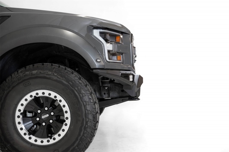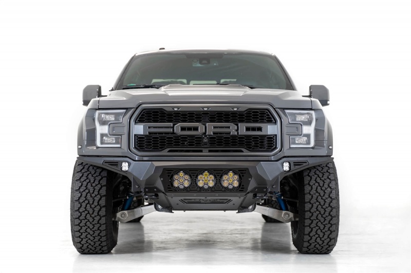 The Addictive Desert Designs Bomber front bumper for the Ford Raptor is the ultimate combination of form and function. The modern plate steel face of the bumper gives an aggressive styling, while the full 3/16 aluminum skid plate allows the Bomber to be lighter than the OEM bumper. The Bomber is offered in two varieties: with 4 Rigid 360 6 in. light mounts or 3 Baja Designs LP6 light mounts in the center. Additional cube light mounts on each side of the bumper give even more lighting options. OEM tow hooks are retained for added utility. As always, this bumper is fully bolt-on and made in America.. The Addictive Desert Designs Bomber front bumper for the Ford Raptor is the ultimate combination of form and function. The modern plate steel face of the bumper gives an aggressive styling, while the full 3/16 aluminum skid plate allows the Bomber to be lighter than the OEM bumper. The Bomber is offered in two varieties: with 4 Rigid 360 6" light mounts or 3 Baja Designs LP6 light mounts in the center. Additional cube light mounts on each side of the bumper give even more lighting options. OEM tow hooks are retained for added utility. As always, this bumper is fully bolt-on and made in America.. Ford Raptor Bomber Front Bumper with 3 Baja Designs LP6 Mounts and Dually Mounts on Sides in Hammer Black with Satin Black panels. Hammer black powder coat finish; Satin black powder coat panel finish; Mounts for 3 Baja Designs LP6 round lights;. Bomber Front Bumper; Hammer Black Powder Coat Finish; Mounts For 3 Baja Designs LP6;. Addictive Desert Designs 17-20 Ford Raptor F-150 Bomber Front Bumper. Mounts For 3 Baja Designs Lp6 Round Lights. Satin Black Powder Coat Panel Finish. Addictive Desert Designs - Bumpers. Hammer Black Powder Coat Finish. Bomber Front Bumper. Bumper- Front. Bumpers. Bumper