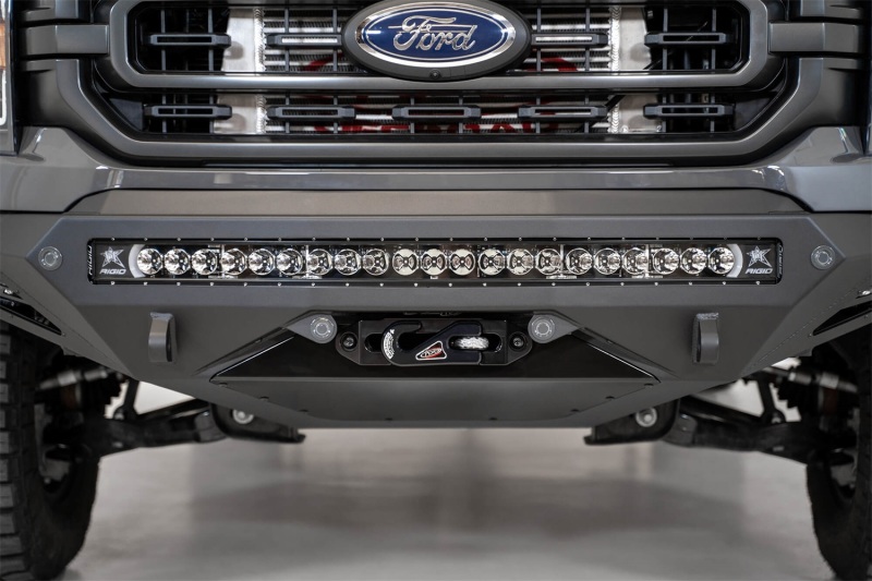 The Stealth Fighter is a plate steel bumper with a radiused front edge that keeps it tight to the truck. There is a universal light mount system in the center of the bumper that holds up to a 40 in. radius light bar or 10 cube lights. Each side panel has a mount capable of holding either a 10 in. single row light bar or a cube light. Reinforced clevis mounts provide a mounting point for 3/4 in. D-Rings, while the optional Winch mount provides even more utility. Sensor cutouts make this bumper compatible with both sensor and non-sensor trucks. As always, this bumper is fully bolt-on and made in America.. The Stealth Fighter is a plate steel bumper with a radiused front edge that keeps it tight to the truck. There is a universal light mount system in the center of the bumper that holds up to a 40" radius light bar or 10 cube lights. Each side panel has a mount capable of holding either a 10" single row light bar or a cube light. Reinforced clevis mounts provide a mounting point for 3/4" D-Rings, while the optional winch mount provides even more utility. Sensor cutouts make this bumper compatible with both sensor and non-sensor trucks. As always, this bumper is fully bolt-on and made in America.. Winch mount; Fits sensor and non-sensor models; Hammer black powder coat finish; Satin black powder coat panel finish; Mounts for up to 10 cube lights or 40 inch light bar; Mounts for cube lights or 10 inch SR light bar;. Ford F150 Stealth Fighter Winch Front Bumper with 10 Cube Mounts/Universal Plate on op and 10" SR/Cube Mounts on Sides with SENSOR Cutouts with D-ring Mounts in Hammer Black with Satin Black panels. Stealth Fighter Front Bumper; Hammer Black; Panel Color Satin Black; Mount For Up To 10 Cube Lights Or 40 in. Light Bar;. Addictive Desert Designs 2021 Ford F-150 Stealth Fighter Winch Front Bumper. Requires Intercooler Relocation Kit For 3.5L Models. Mounts For Up To 10 Cube Lights Or 40 in. Light Bar. Mounts For Cube Lights Or 10 in. Light Bar On Sides. Satin Black Powder Coat Panel Finish. Addictive Desert Designs - Bumpers. Fits Sensor And Non-Sensor Models. Hammer Black Powder Coat Finish. Stealth Fighter Front Bumper. Bumper- Front. Winch Mount. Bumpers. Bumper