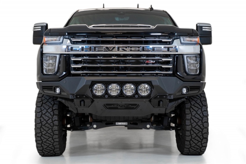 The Addictive Desert Designs Bomber Front Bumper is a slim fitting bumper for your 2020 and up Chevy 2500. A modern plate steel design gives a clean look, while the full 3/16 in. aluminum skid plate cuts down on weight. Reinforced mounts for 3/4 in. D-Rings bolt straight to your frame for unrivaled strength. This Chevy 2500 HD Front Bumper comes with four Rigid 360 6 in. light mounts, and two additional cube light mounts behind the side panels. As always, this bumper is fully bolt-on and made in America by ADD Offroad.. Three different lighting options are available: 4 Rigid 360 6" light mounts, 3 Baja Designs LP6 light mounts, or two 20" light bar mounts. They have two additional cube light mounts behind the side panels. The Bomber is fully bolt-on.. The Addictive Desert Designs Bomber Front Bumper for the 2020 and up Chevy 2500 is a slim fitting bumper. It's made with plate steel and has full 3/16" aluminum skid plates, as well as reinforced mounts for 3/4" D-Rings.. Chevy 2500 2020-Up Bomber Front Bumper With 4 Rigid 360 6" Mounts In Center Dually Mounts In Side Pods With Parking Sensor Cutouts In Hammer Black with Satin Black Panels. Hammer black powder coat finish; Satin black powder coat panel finish; Mounts for 4 RIGID 360 6" round lights;. Bomber Front Bumper; Hammer Black; w/ Satin Black Panels; Mounts For 4 Rigid 360 6 in.;. ADD 20-23 Chevy 2500/3500 Bomber Front Bumper. Satin Black Powder Coat Panel Finish. Addictive Desert Designs - Bumpers. Hammer Black Powder Coat Finish. Bomber Front Bumper. Bumper- Front. Bumpers. Bumper