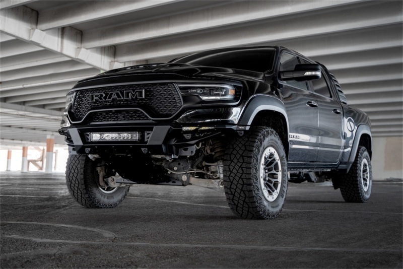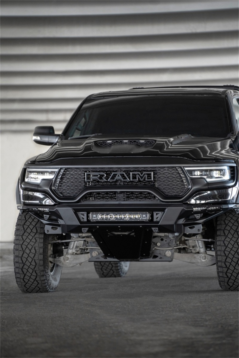 Revamp your ride with the Phantom Series TRX Front Bumper. With a sleek, low profile and prerunner inspired design, this bumper will give your ride an instantly upgraded look. Constructed from plate steel for a more enhanced style, the knife's edge design mimics the look of trailing arms. It comes with a lightweight 3/16-inch aluminum skid plate which provides full protection without adding excess weight. The skid also boasts vented cutouts to ensure proper air flow to the intercooler.. This low-profile TRX front bumper features a prerunner inspired layout. The Phantom is constructed from plate steel for a more enhanced style, rather than the traditional tube steel. Its knife's edge design was intended to mimic the look of trailing arms. A lightweight 3/16-inch aluminum skid plate provides full protection without adding excess weight. The skid also features vented cutouts for proper intercooler air flow.. Ram TRX 2021 - Up Phantom Front Bumper With Mounts For Universal 20" RDS And Mounts For Universal 10" Single Row Light In Sides In Hammer Black With Satin Black Panels. Hammer black powder coat finish; Satin black powder coat panel finish; 20" light bar mount; 2 - 10" single row led light mounts; Parking sensor cutouts. Phantom Front Bumper; Hammer Black Powder Coat Finish; 20 In. Light Bar Mount;. ADD 21-23 Ram TRX Phantom Front Bumper. 2 - 10 In. Single Row LED Light Mounts. Satin Black Powder Coat Panel Finish. Addictive Desert Designs - Bumpers. Hammer Black Powder Coat Finish. 20 In. Light Bar Mount. Parking Sensor Cutouts. Phantom Front Bumper. Bumper- Front. Bumpers. Bumper