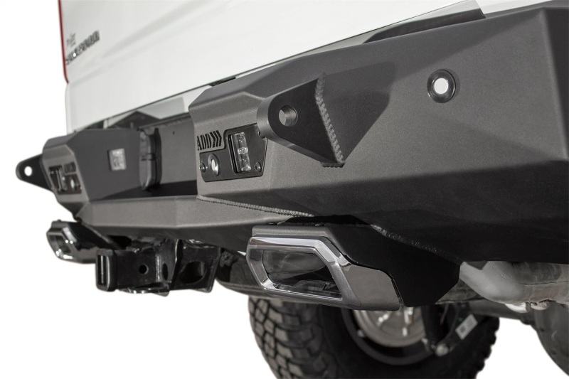 Upgrade your Chevy/GMC 1500 rear bumper with the Stealth Fighter plate steel bumper. The unique styling transforms the look of your truck while retaining the utility of your factory tow hitch and trailer plug. Two rear facing cube light mounts provide your Silverado/Sierra with additional lighting and optional backup sensor cutouts retain your truck's OEM utility. D-Ring mounts have been reinforced so your truck isn't left stranded in a crucial situation. Fully bolt-on means that no cutting or welding is required for installation.. Chevy/GMC 1500 Stealth Fighter Rear Bumper with PARKING SENSOR CUT OUTS with EXHAUST TIPS set up for Duallys and D-Ring Clevis Mounts in Hammer Black with Satin Black Panels. Backup sensor cutouts; Exhaust tips; Hammer black powder coat finish; Satin black powder coat panel finish; Mounts for cube lights;. Addictive Desert Designs 19-20 GM 1500 Stealth Fighter Rr Bumper w/ Backup Sensor Cutouts. Stealth Fighter Rear Bumper; Hammer Black; w/Exhaust Tips And Backup Sensor;. Satin Black Powder Coat Panel Finish. Addictive Desert Designs - Bumpers. Hammer Black Powder Coat Finish. Stealth Fighter Rear Bumper. Mounts For Cube Lights. Backup Sensor Cutouts. Bumper- Rear. Exhaust Tips. Bumpers. Bumper