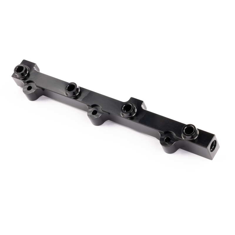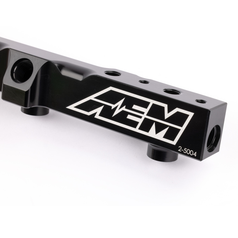 AEM High Volume fuel rails feature a 1/2-inch fuel bore to support fuel flow for applications up to 1,000 horsepower. This large bore also dampens backpressure pulses created by larger injectors and works perfectly with stock injector sizes. An additional 1/8th NPT port is included to accommodate a nitrous set up or fuel pressure gauge. A custom fuel line fitting is included for the factory fuel line, and in most cases the ends of each rail are pre tapped to accept -6 AN or 9/16"x18 fittings for users who want to use custom fuel lines.. No additional parts required for installation - installs with factory fuel line using supplied fitting. High Volume Fuel Rail, Black Anodized, Fits Honda F22A1, F22A4, F22A6, H22A1, H22A4 and H23A1 engines. Comprehensive installation instructions, hardware, fittings and injector O-rings included. High Volume Fuel Rail. Black. Honda F22A1, F22A4, F22A6, H22A1, H22A4 & H23A1. AEM 90-93 Accord DX/LX/SE/EX & 92-01 Prelude S/Si/Si VTEC Black Fuel Rail. 1/2 inch bore dampens backpressure pulses from larger fuel injectors. 1/8 NPT port included for nitrous pick up or fuel pressure gauge. Fits Honda F22A1, F22A4, F22A6, H22A1, H22A4 and H23A1 Engines. Complete hardware, fittings and injector O-rings included. Works with factory fuel line or custom fuel lines. Specifically engineered for each application. Pre-tapped for -6 AN or 9/16"x 18 fittings. Supports fuel flow up to 1,000 horsepower. AEM High Volume Fuel Rail. Black. Honda. Manufactured and assembled in the USA. Black anodizing with laser engraving. CNC Machined from billet aluminum. F.R.K. PRE 92-01 ACC 90 BLK. AEM - Hi Vol Fuel Rail. Fuel Injector Rail. Hi Vol Fuel Rail