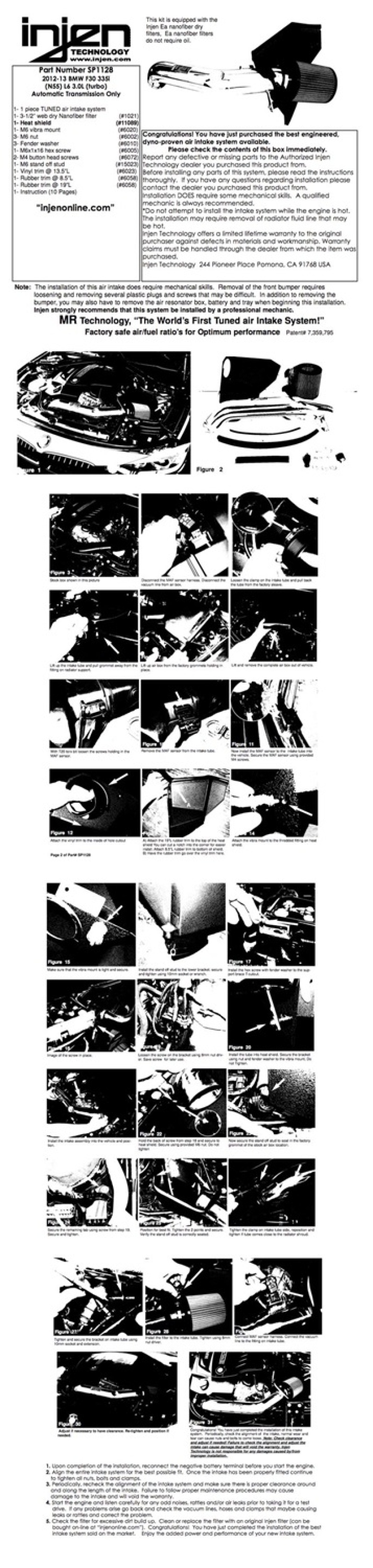 Is your engine choking for air and in need of some additional horsepower? If so, Injen has exciting news for you! The SP series of cold air intakes from Injen Technology will allow your engine to breathe deeper and enhance the performance that you've been craving. The SP series of cold air intakes is Injen's flagship system in their lines of traditional aluminum cold air intake systems. Injen Technology is the world's first tuned air intake system and holds four (4) patents on the tuning process of an intake system ? something no other manufacturer can claim. The SP series of cold air intakes feature many of Injen Technology's patented tuning process, including MegaRam (MR) Technology (Patents 7,359,795 and 7,669,571), Air Fusion (Patents 7,757,548 and 7,721,699), and many other innovations that keep Injen Technology at the forefront in the performance aftermarket. , , The soul of this intake is found within 6061-T6 aluminum air intake tube that provides a smooth uninterrupted path for highly efficient airflow. Our engineers have painstakingly designed the intake to provide the highest levels of safe power, along with clean aesthetics that will impress every time you open your hood. In addition to the impressive power increase, the Injen team has ensured that a safe Air fuel (A/F) ratio has been maintained throughout the power band. , , Additionally, this SP intake includes a fully serviceable Injen SuperNano-Web dry air filter, which provides increased filter surface area allowing for greater airflow and unbeatable filtration. If that's not enough, the Injen SP performance intake provides power you can hear and feel! This intake provides an aggressive and throaty tone that is unmatched in the aftermarket. Want to add that personalized touch to your intake? You're in luck, as Injen also offers this intake system in multiple finishes. To top it all off, this SP CAI kit includes the unbeatable Injen Technology limited Lifetime Warranty!. The Injen SP Series Intake systems Feature the Patent Pending MR Technology Process for Optimal Gains and a safe A/F ratio. The Injen SP Series Intake is The Worlds First Tuned Intake System.. This product is not currently CARB exempt and is not available for purchase in California or for use on any vehicle registered with the California Department of Motor Vehicles.. Short Ram Air Intake System; Incl. Tubing/Filter/Hardware/Instruction; w/Powder Coated Air Box; HP Gains +13.0 HP/Torque Gains +11.0 ft. lbs.; Wrinkle Black;. Injen 12-13 BMW 335i (N55) 3.0L L6 (turbo) AUTO TRANS ONLY Wrinkle Black Short Ram Intake w/ MR Tech. SP Short Ram Air Intake System, Part No. SP1128WB, 2012-2018 BMW M135i, M235i, M335i, M435i, M2. BMW 2016 (F87) M2L6-3.0L Turbo N55Tuned intake w/powder coated air box and Nano-web dry filter. Includes custom heat shield w/cover specifically designed for this application. Smooth intake piping eliminates restrictions and improves airflow. Dyno Proven gains of up to 13 hp and 11 lb-ft. of torque. Fully serviceable Injen SuperNano-Web dry air filter. Optional hydroshield part number 1037BLK or 1037RED. Provides power gains while maintaining A/F ratios. Replacement air filter part number X-1021-BB. Wrinkle Black SP Short Ram Air Intake System. Aggressive engine tone under full throttle. Injen Technology Limited Lifetime Warranty. Does NOT fit the 2013 M135i E82 chassis.. Increased Torque Up To 11 ft./lbs.. 6061-T6 aluminum intake tubing. Available in multiple finishes. Made in Pomona, California USA. No additional tuning required. Short Ram Air Intake System. Short Ram Air Intake Design. Injen Short Ram Intake. Engine Cold Air Intake. Short Ram Intake. Air Intake Kit