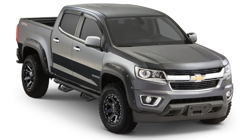 With their recessed stainless steel bolts and massive presence, Pocket Style Fender Flares are a Bushwacker original and an off-road icon. They give you the hard-core look of bolt-on flares, with no body-side sheet metal drilling required. Pocket Style Fender Flares are custom-designed for your vehicle to complement oversized tires and high-clearance lift kits. You can mount them right out of the box with their tough, OEM-style matte black finish they're UV protected so they won't chalk. You can also paint them to match or accent the body color for a factory-custom look. Pocket Style Fender Flares are made from our thick, warp-resistant Dura-Flex 2000 material and tailor-made for added durability and flexibility on the trail. When you need maximum tire coverage with minimum time and effort, it's in the pocket. Pocket Style Fender Flares from Bushwacker.. Pocket Style® Fender Flares; 4 pc.; Front Tire Coverage 1.5 in.; Front Height 5.5 in.; Rear Tire Coverage 1.5 in; Rear Height 5.5 in.; Smooth Finish; Black;. Precision engineered for a perfect fit that provides the rugged look of bolted-on flares without drilling through the body. Precision Engineered For A Perfect Fit That Provides The Rugged Look Of Bolted-On Flares w/o Drilling Through The Body. Installs easily with little to no drilling/trimming required -- all hardware is included. Installs Easily With Little To No Drilling/Trimming Required - All Hardware Is Included. Whether On-Road Or Off - Our Heavy-Duty Hardware Holds The Flares Securely In Place. Whether on-road or off, our heavy-duty hardware holds the flares securely in place. Bushwacker 15-18 Chevy ado Fleetside Pocket Style Flares 4pc 74.0in Bed - Black. 100 Percent UV Protected Smooth Matte Black Smooth Finish Can Be Easily Painted. 100% UV protected smooth matte black smooth finish can be easily painted. Pocket/Rivet Style Fender Flares Black Smooth Finish 4-Piece Set. Made Of Durable - Yet Flexible Dura-Flex 2000 ABS Material. Made of durable, yet flexible Dura-Flex 2000 ABS material. Tire coverage varies with vehicle: 0.5 In.- 3 In.. Tire Coverage Varies With Vehicle 0.5 in.- 3 in.. Fender Flares Pocket Style 4Pc. Bushwacker FF Pocket Style 4Pc. Pocket Style® Fender Flares. Limited Lifetime Warranty. FF Pocket Style 4Pc. Fender Flare