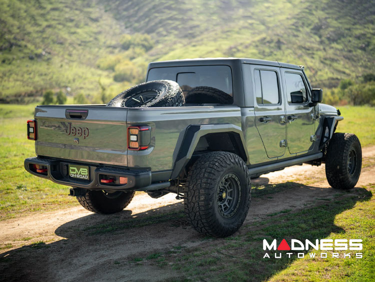- Relocates spare tire to the bed of the Jeep Gladiator.