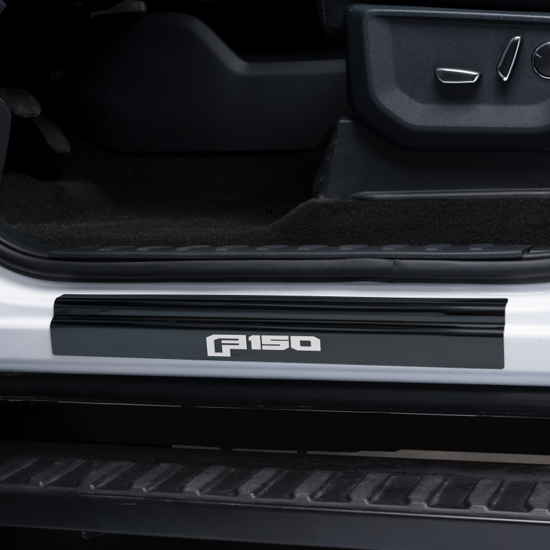 Ford F-150 Door Sill Protectors - Front + Rear - Putco - Black Platinum Stainless Steel, Laser-Etched Logo, 3M Adhesive - Black Platinum - `15-`20