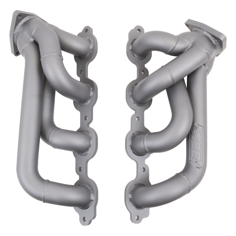 These BBK Performance shorty tuned Length exhaust Headers are designed and constructed as direct fit replacements for all 14-18 Chevrolet GM 5.3 6.2 Full Size Truck applications. Each header is manufactured with 1-3/4 in. CNC mandrel bent tubing that offers unrestricted exhaust flow for increased horsepower and torque over factory OEM manifolds. BBK tuned Length headers offer improved scavenging waves for better combustion, which leads to improved performance and fuel economy over stock or equal Length headers. As with all BBK Performance exhaust headers they feature a 3/8 in. laser cut flange for additional strength and a guaranteed leak free fit. All headers are robotically and precision hand welded and then pressure tested to ensure years of reliability and performance in the real world. All BBK exhaust headers are available in a titanium ceramic or polished silver ceramic coated finish and include new exhaust header gaskets, header bolts and hardware to complete the installation.. These BBK Performance shorty tuned Length exhaust Headers are designed and constructed as direct fit replacements for all 14-18 Chevrolet GM 5.3 6.2 Full Size Truck applications. Each header is manufactured with 1-3/4" CNC mandrel bent tubing that offers unrestricted exhaust flow for increased horsepower and torque over factory OEM manifolds. BBK tuned Length headers offer improved scavenging waves for better combustion, which leads to improved performance and fuel economy over stock or equal Length headers. As with all BBK Performance exhaust headers they feature a 3/8" laser cut flange for additional strength and a guaranteed leak free fit. All headers are robotically and precision hand welded and then pressure tested to ensure years of reliability and performance in the real world. All BBK exhaust headers are available in a titanium ceramic or polished silver ceramic coated finish and include new exhaust header gaskets, header bolts and hardware to complete the installation.. All BBK Performance parts are backed by a 1-YEAR manufacturer’s warranty from the original date of purchase. An optional extended warranty is also available - giving you an additional 2 or 3 years from original date of purchase. Costs for the extended warranty option can be viewed when the item is added to your cart. The manufacturer’s warranty is based on normal use and installation of each product.. Titanium Ceramic Finish - New Gaskets And Hardware included - CNC Mandrel Bent Primary Tubes For Unrestricted Flow - Direct Bolt On. 2014-2018 Chevrolet GM Truck 5.3L 6.2L 1-3/4 Shorty Exhaust Headers (TITANIUM CERAMIC). BBK 14-18 GM Truck 5.3/6.2 1 3/4in Shorty Tuned Length Headers - Titanium Ceramic. 2014-2018 Chevy GM Truck 5.3L 6.2L 1-3/4 Shorty Headers (TITANIUM CERAMIC). Shorty Tuned Length Exhaust Header Kit; Titanium Ceramic; 1-3/4 in. Dia.;. Shorty Tuned Length Exhaust Header Kit. BBK Headers - Shorty. Headers - Shorty. Made In The USA. Exhaust Header. Headers-Shorty