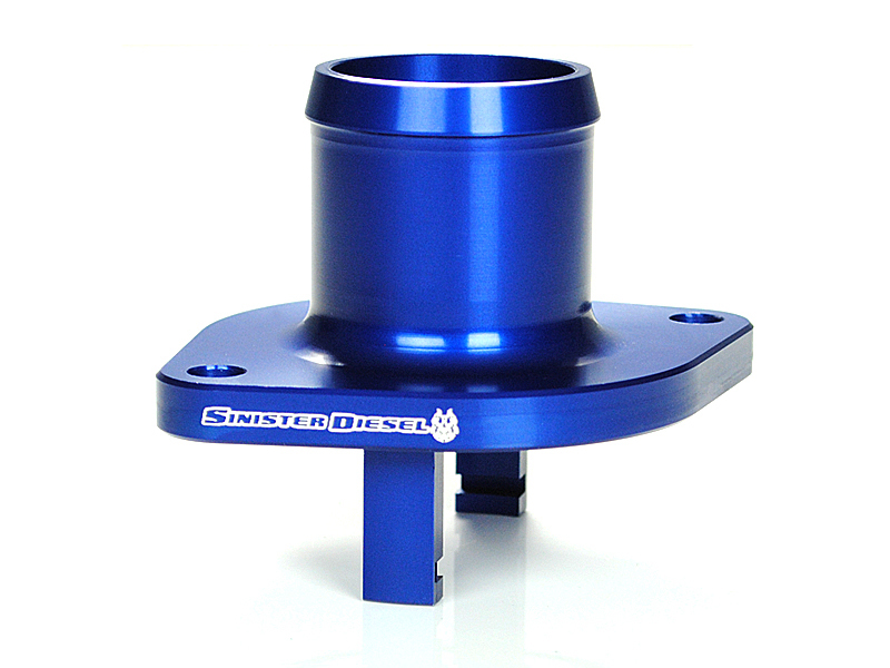 The Sinister Diesel Thermostat Housing is a drop-in replacement for the OEM housing, with several advantages. It's anodized billet aluminum construction resists corrosion that often plagues OEM units. The Precision CNC machining and thick base plate ensure a complete seal for years to come. It's finished off in our Signature Sinister Blue to add some great looks to your engine bay. NOTE: This thermostat housing is NOT compatible with Mishimoto thermostats, Features:6061 T6 Billet Aluminum Construction, Longer life with a leak-proof seal, Tough, heat-resistant design, Blue Anodized FinishIncludes:(1) Sinister Diesel Thermostat Housing, (1) O-ring seal.. This product has a blue anodized finish for extra protection and a clean and stylish appearance. Sinister Diesel 03-07 Ford 6.0L Powerstroke Thermostat Housing. Thermostat Housing for 2003-2007 Ford Powerstroke 6.0L.. Sinister Diesel Thermostat Housing. 2003-2007 Ford F-250; F-350; 6.0L. Engine Coolant Thermostat Housing. Thermostat Housing