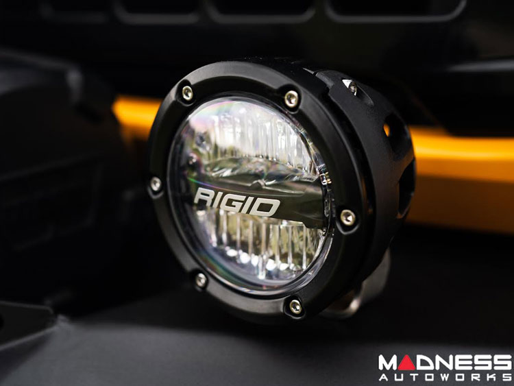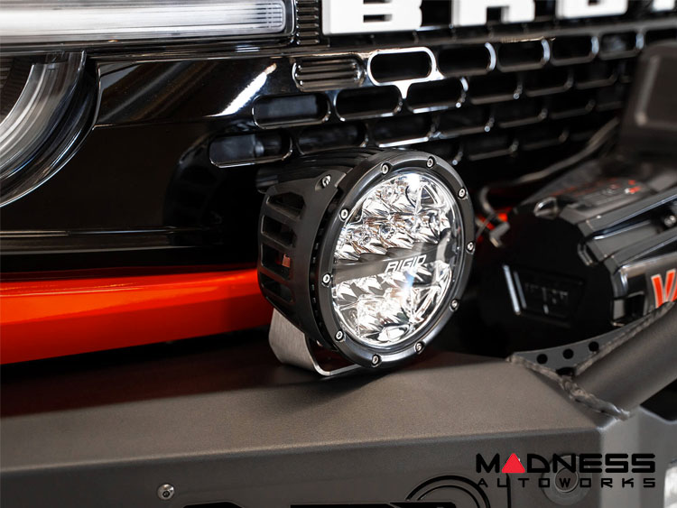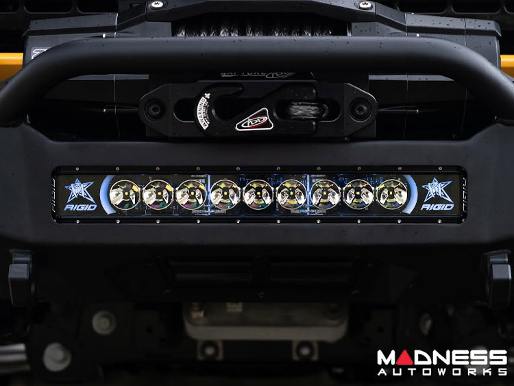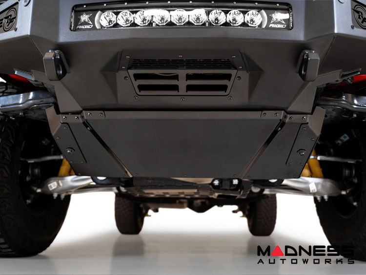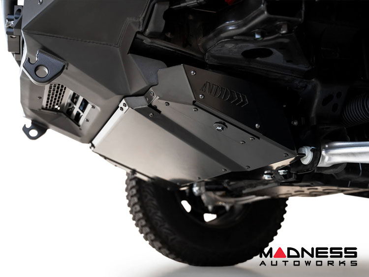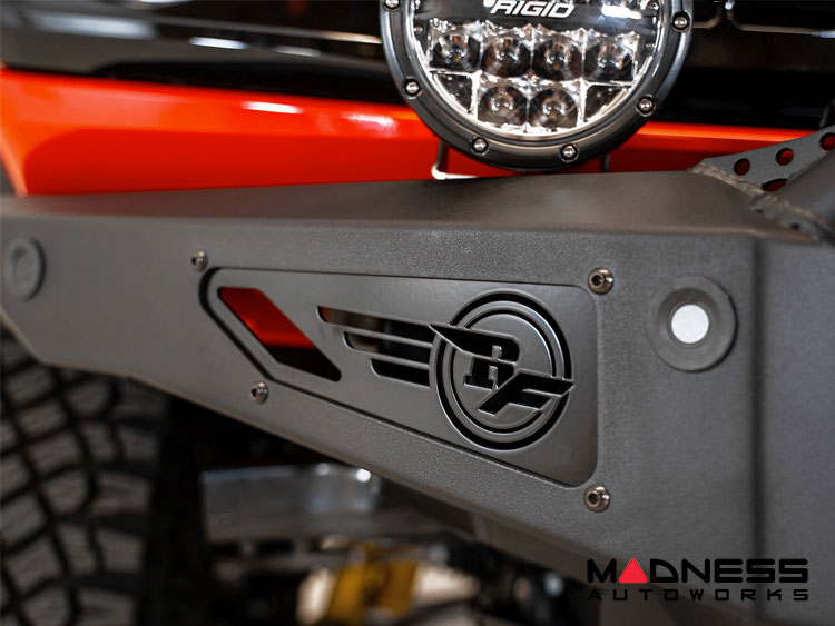 This Bronco front bumper retains OEM parking sensor locations, and there is an adaptive cruise control relocation bracket available. The Rock Fighter has an integrated bumper skid plate featuring louvers to allow airflow to the intercooler. Additionally, we offer an optional 3/16-inch aluminum alloy front skid plate to provide superior protection to the underbelly, as opposed to the OEM plastic skid. There are also 2 reinforced clevis mounts for ¾-inch D-rings for recovery options if you find yourself in a tough situation. Designed for off-road function and it’s aggressive styling, the Rock Fighter looks great with any style fenders. As always, this is fully bolt-on and Made in America.