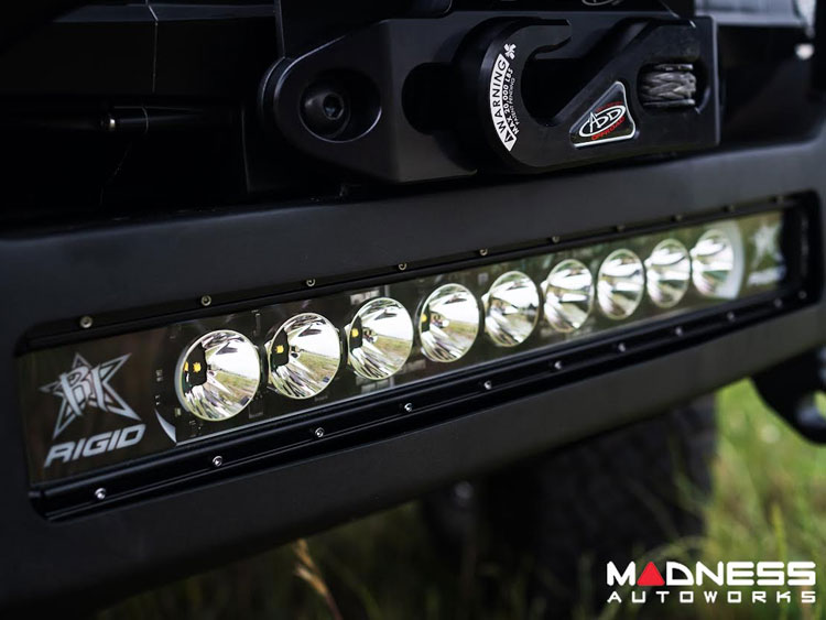 At the center of the bumper is a universal light mount ready for up to a 20-inch radius light bar, or 5 cube lights. There are two light mounts for round lights on top, on either side of the low profile top hoop and standard winch mount.