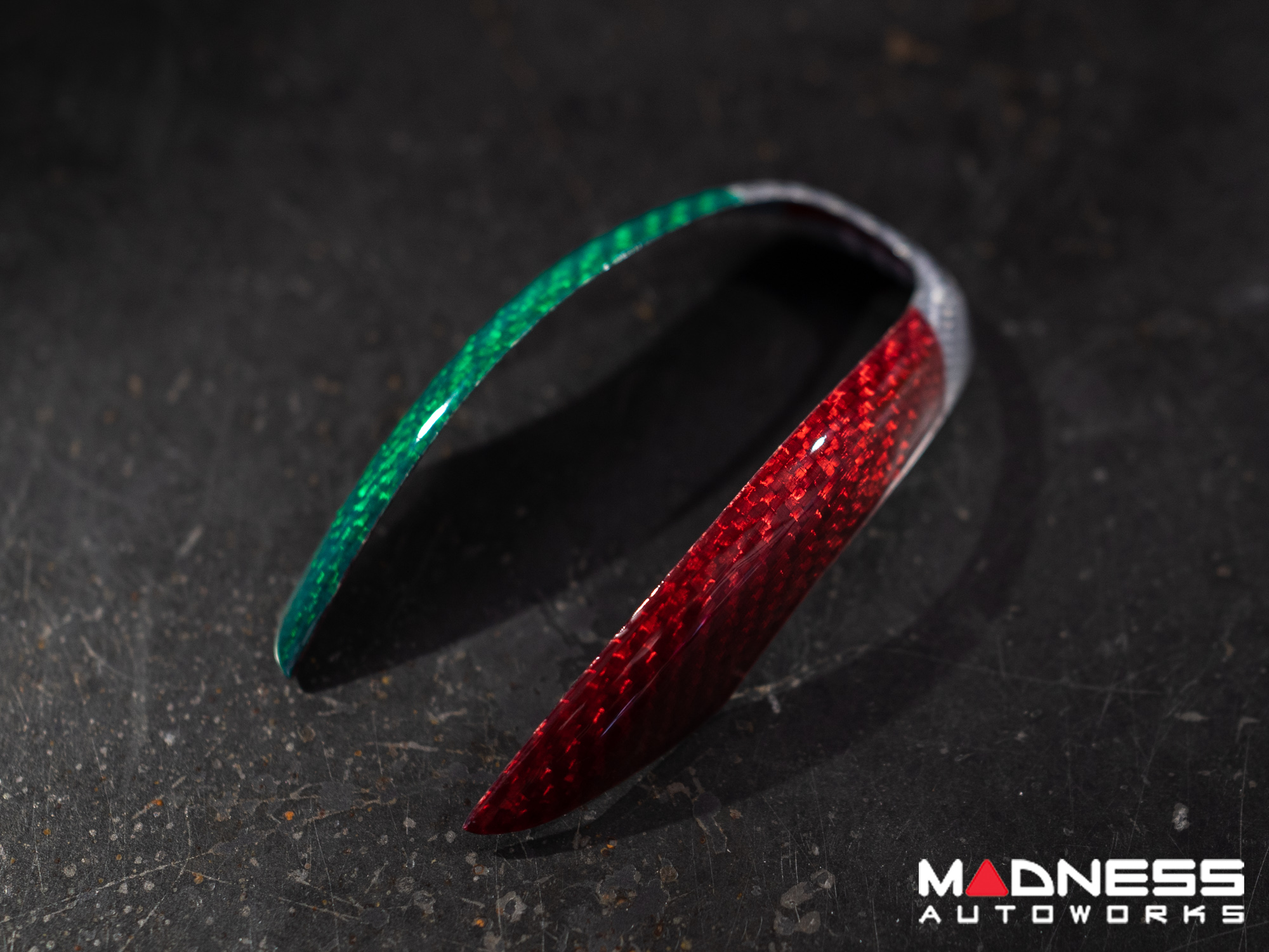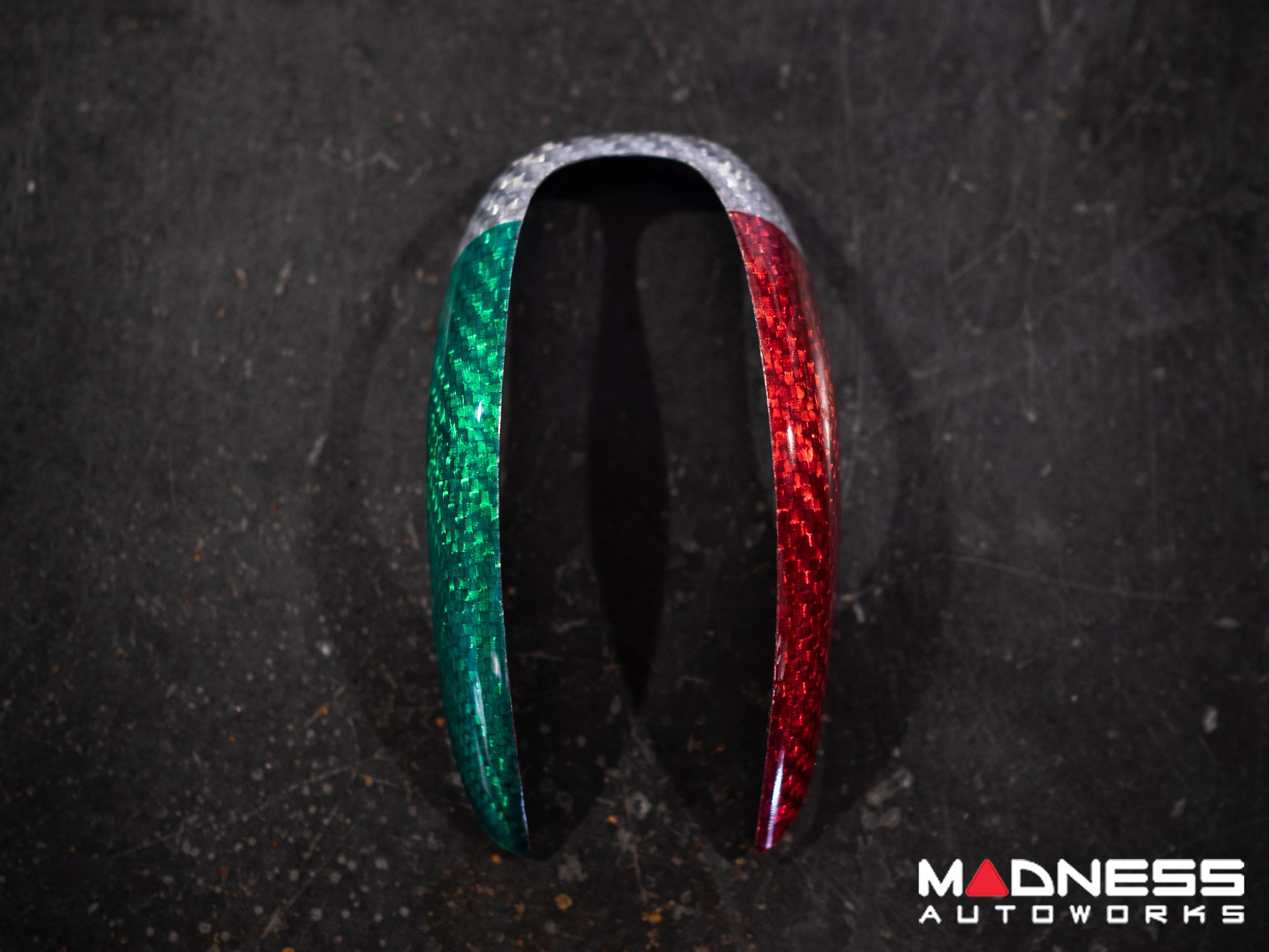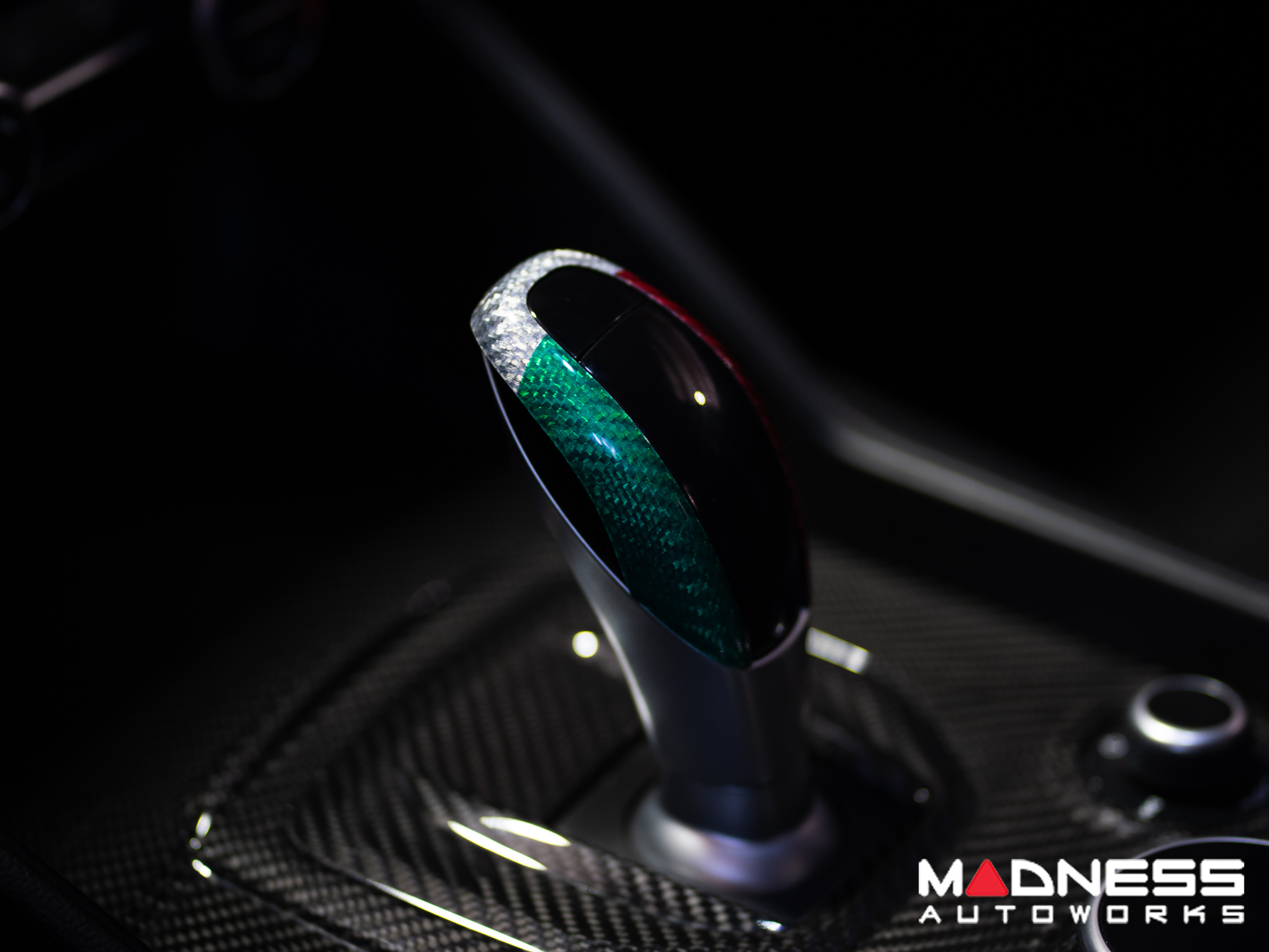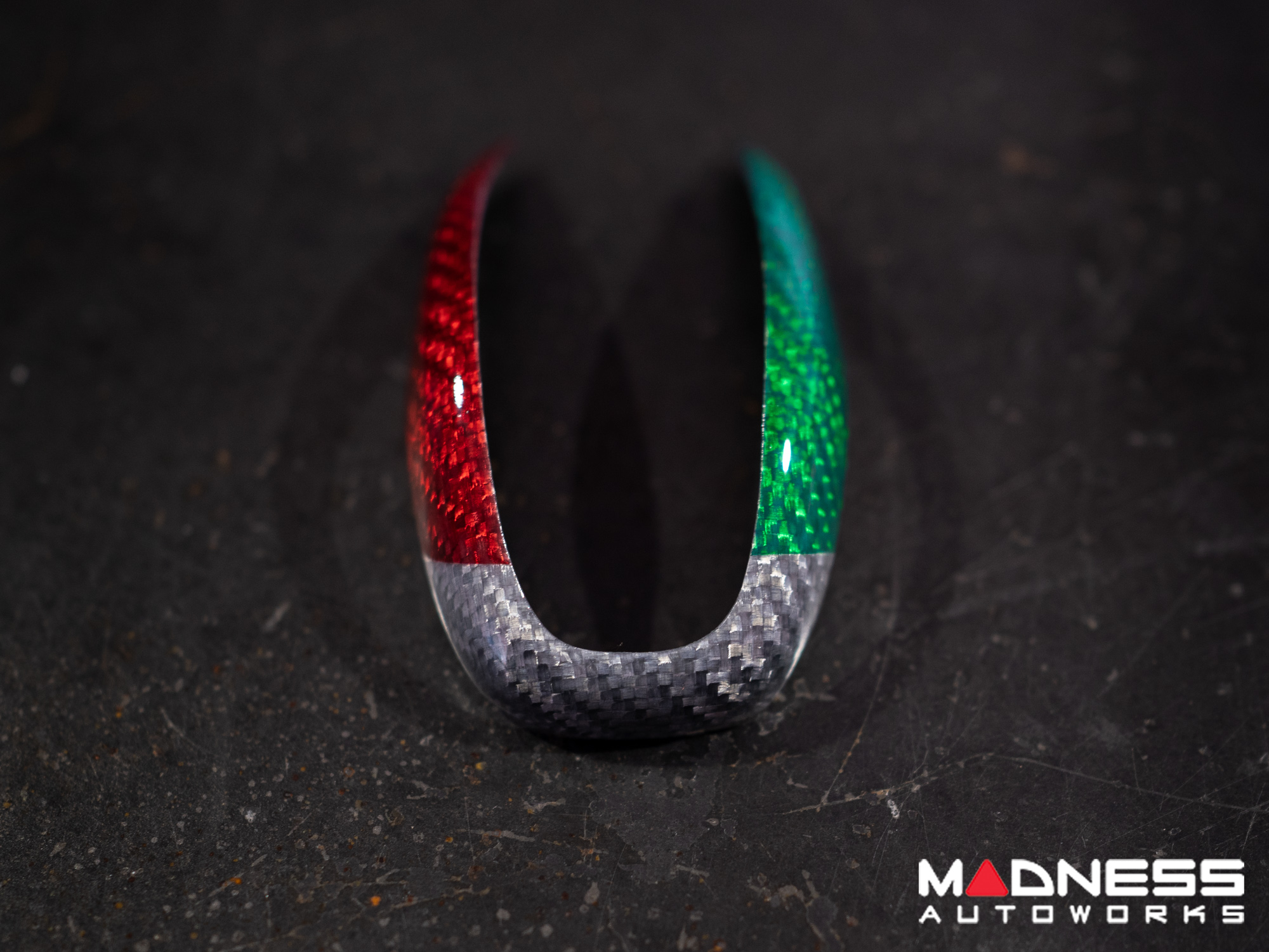 This Genuine Carbon Fiber Gear Knob Trim gives a nice accent to your factory gear knob and installs with ease. This version comes in a Custom Italian Theme for an extra detail.