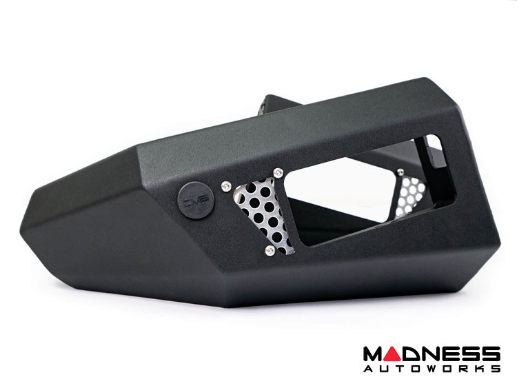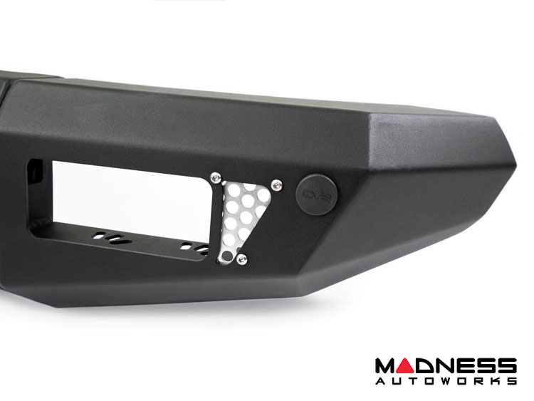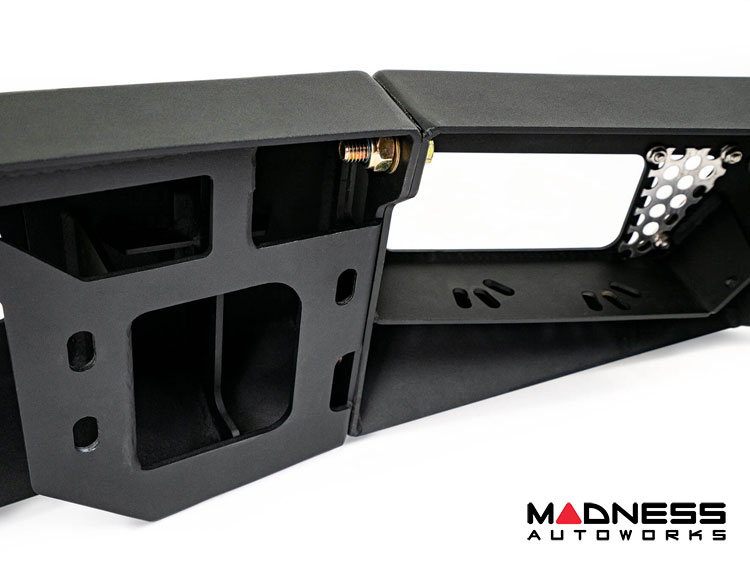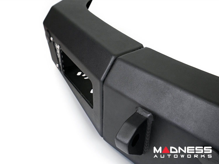 Behind this cutaway pattern, a Dual Row 20-inch LED light bar can mounted. It features pod light mounts on each side of the bumper, that fit 2 pods each.