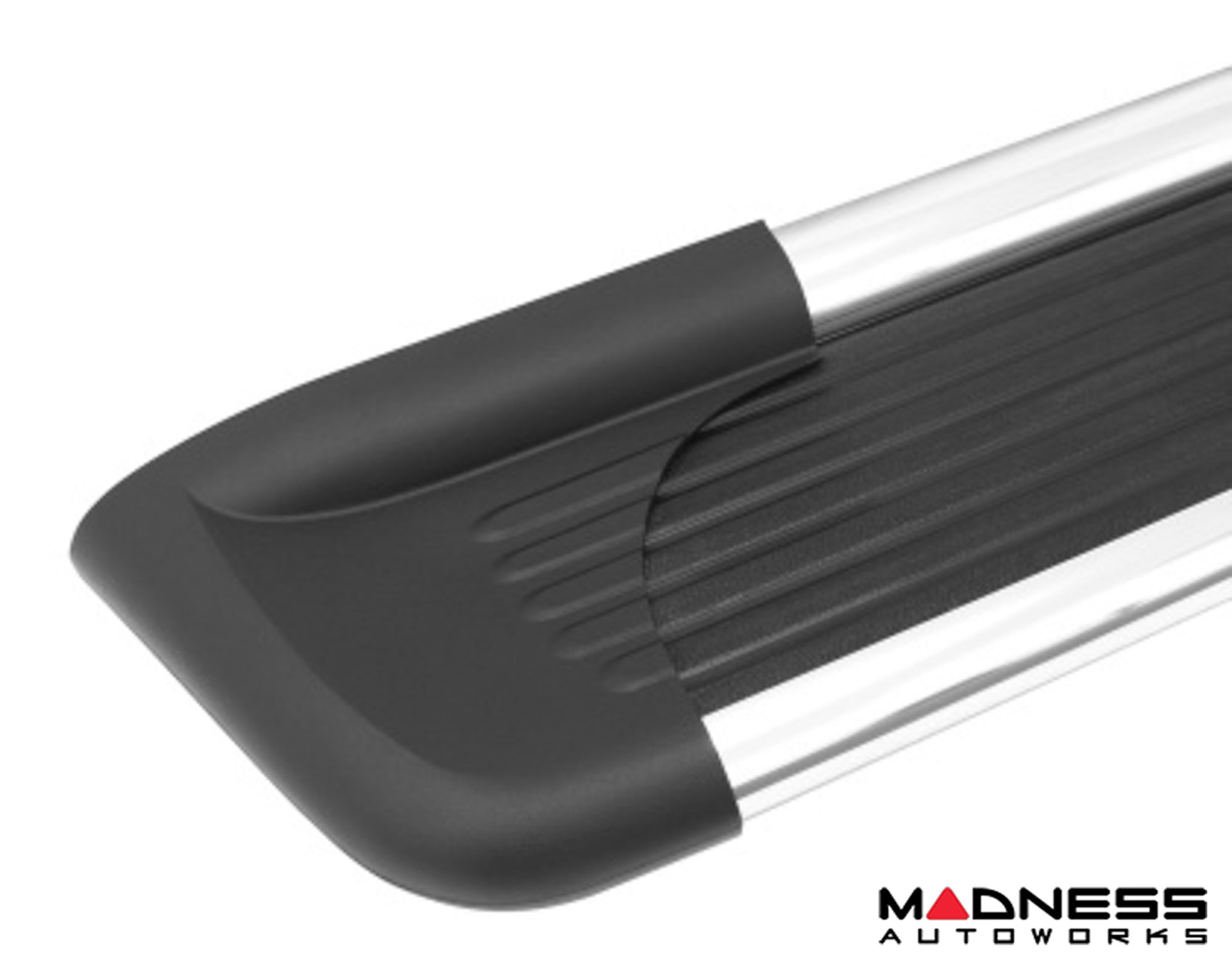 Sure-Grip Running Boards are made of an extruded aluminum base board and provide a slip resistant rubber step area and stylized molded end-caps for a finished look.