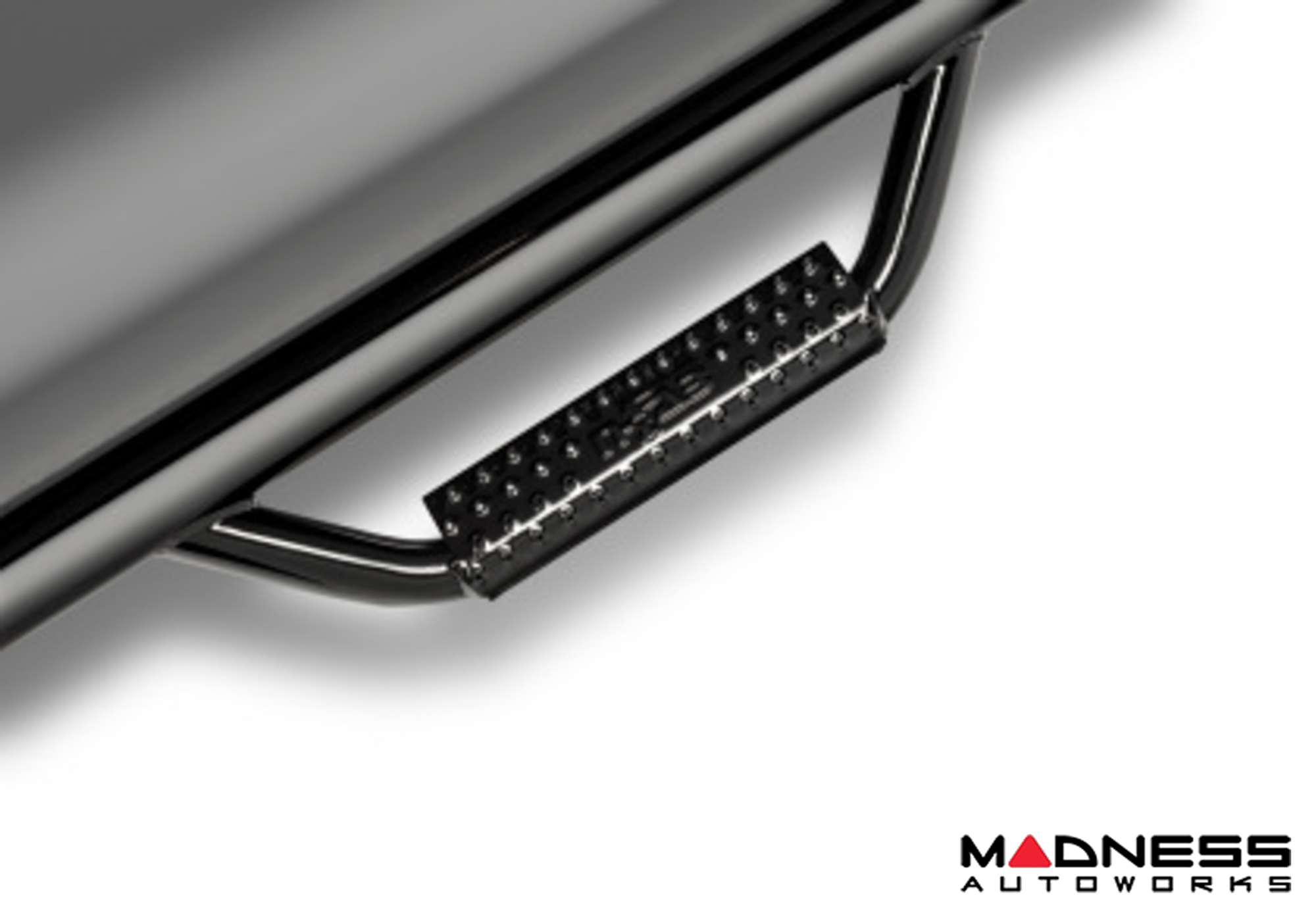 Built with today's work truck in mind, N-FAB offers its patented hoop step design and innovative mounting system in a Cab Length configuration. Designed with classic N-FAB styling, Cab Length Nerf Steps are ideal for flat bed trucks, stake bed trucks, vehicles with campers, and even trucks with side exhaust forward of the rear wheels. Manufactured from .084 wall tubular steel, Cab Length Nerf Steps provide all of the strength and durability for which N-FAB is known. All Nerf Steps have a 5 year Finish and Lifetime Workmanship Warranty.