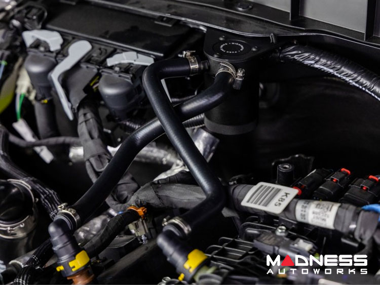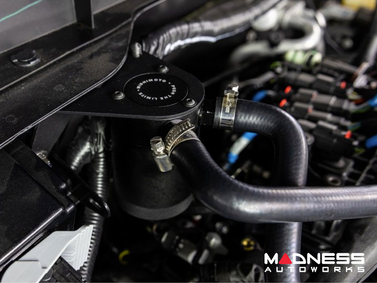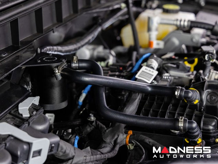This catch can features an internal baffle and air turbulators that help condense oil, fuel, and water vapor from the blow-by, as well as a 50-micron sintered bronze filter that captures carbon particles. The catch can is mounted away from engine vibration with a sturdy 2.5mm-thick steel bracket and molded hoses include Ford-specific quick-disconnect fittings for an easy and clean install.