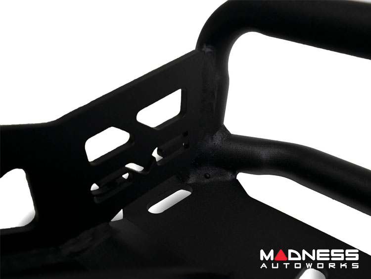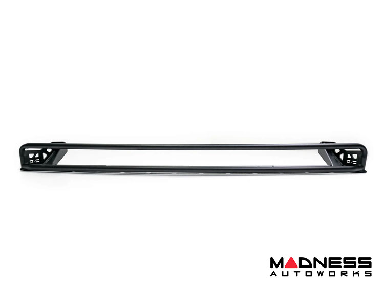 The bracket is constructed with a combination of 3/4" diameter tube steel and 4mm thick plate steel and finished in our micro-texture black powder coat. No modifications are required for install, as this mounts directly to the OEM accessory mounts located above the windshield.