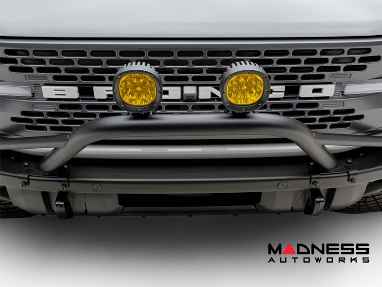 Complete kits include a Ford Bronco Pre-Runner Baja Bar, (2) 4-Inch-High Powered LED lights in White or Amber and a wiring harness with relay and toggle switch.