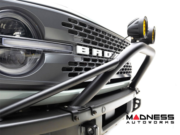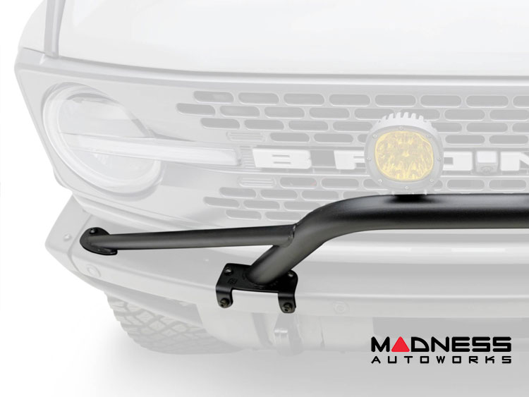 The main hoop is manufactured from high strength 2-inch mild steel tubing and welded to heavy gauge base plates that bolt directly to your Ford Broncos Factory Modular Bumper.