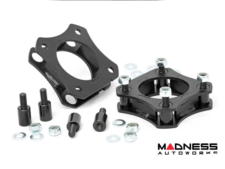 This easy-to-install kit offers increased ground clearance and levels the vehicle from front to rear for a more aggressive look. Rough Country's 1.75" Lift Kit offers front upper strut spacers, laser-cut for a precise fit. This simple solution avoids the headache of strut disassembly or modification of the differential height to install, leaving you with a lightning-fast install process that can be performed in a home garage!