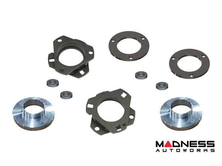 Front lift is achieved with strut spacers and an aluminum preload ring. Rear lift is achieved via strut spacer.