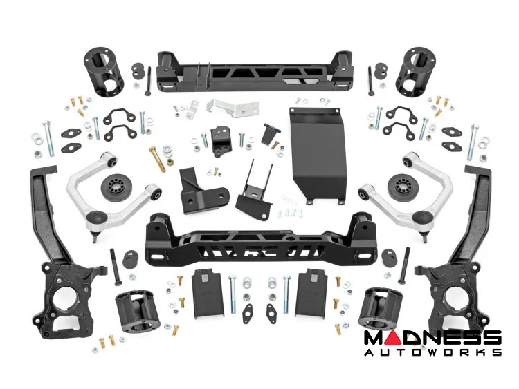 This suspension kit combines the use of durable steel knuckles, forged aluminum control arms, differential brackets, and drop cross members to reduce cv angles and simulate factory angles all while achieving new heights. Featuring a set of upper strut spacers that offer uncompromised strength and rigidity, gaining lift height is no issue. Completing the rear of this suspension kit included is a rear track bar and brake line relocation brackets that allow you to retain factory-like geometry. This combined setup provides enough clearance to run 40" tires with proper wheel backspacing.