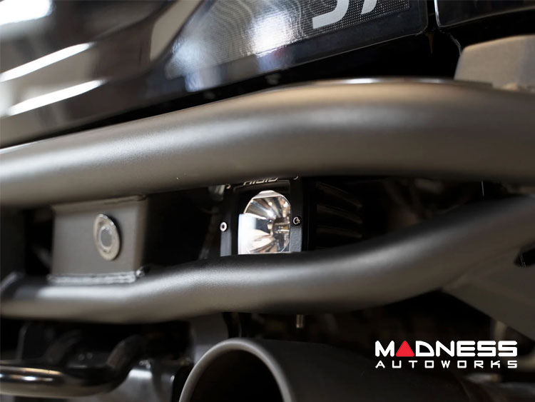 There are pod light mounts towards both ends of the bumper, where 3" LED cube lights can be installed. These could be wired to the reverse lights, or to a separate harness for supplemental lighting while driving off-road.