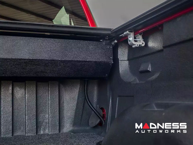 The canister already features a compact design with angled edges for extra clearance. However, for 100% full bed access, the canister can be quickly removed without the need for any special tools.