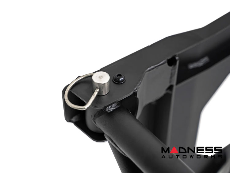 After upgrading to larger tires, the spare tire has been known to cause flex in the tailgate due to the added weight on the factory carrier. The tire guard reinforces the tailgate by mounting to multiple points along the tailgate, increasing rigidity. Additionally, the guard can accept locking pins (not included) for security against theft.