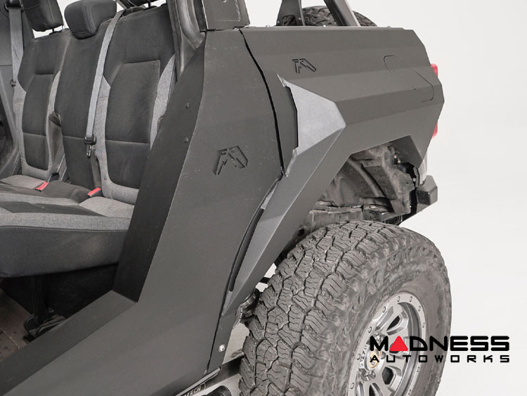 These fenders allow you to run up to a 35-inch tire, front fenders 1 mounting point for a rock-light, front fender vents for added aggressive style, rear fender fuel door replacement w/ magnetic touch latch.