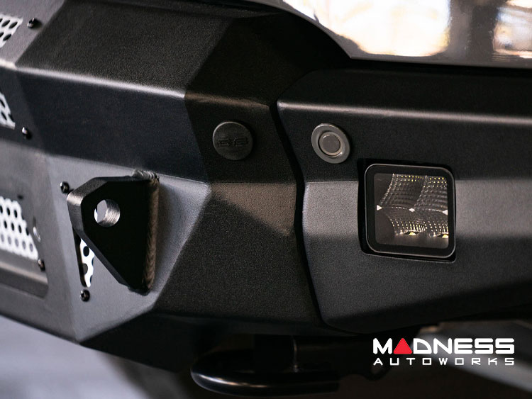Sensor hole mounts accommodate the factory parking sensors. At each side of the bumper are mounting points for 3-inch pod lights for additional lighting on the trail.