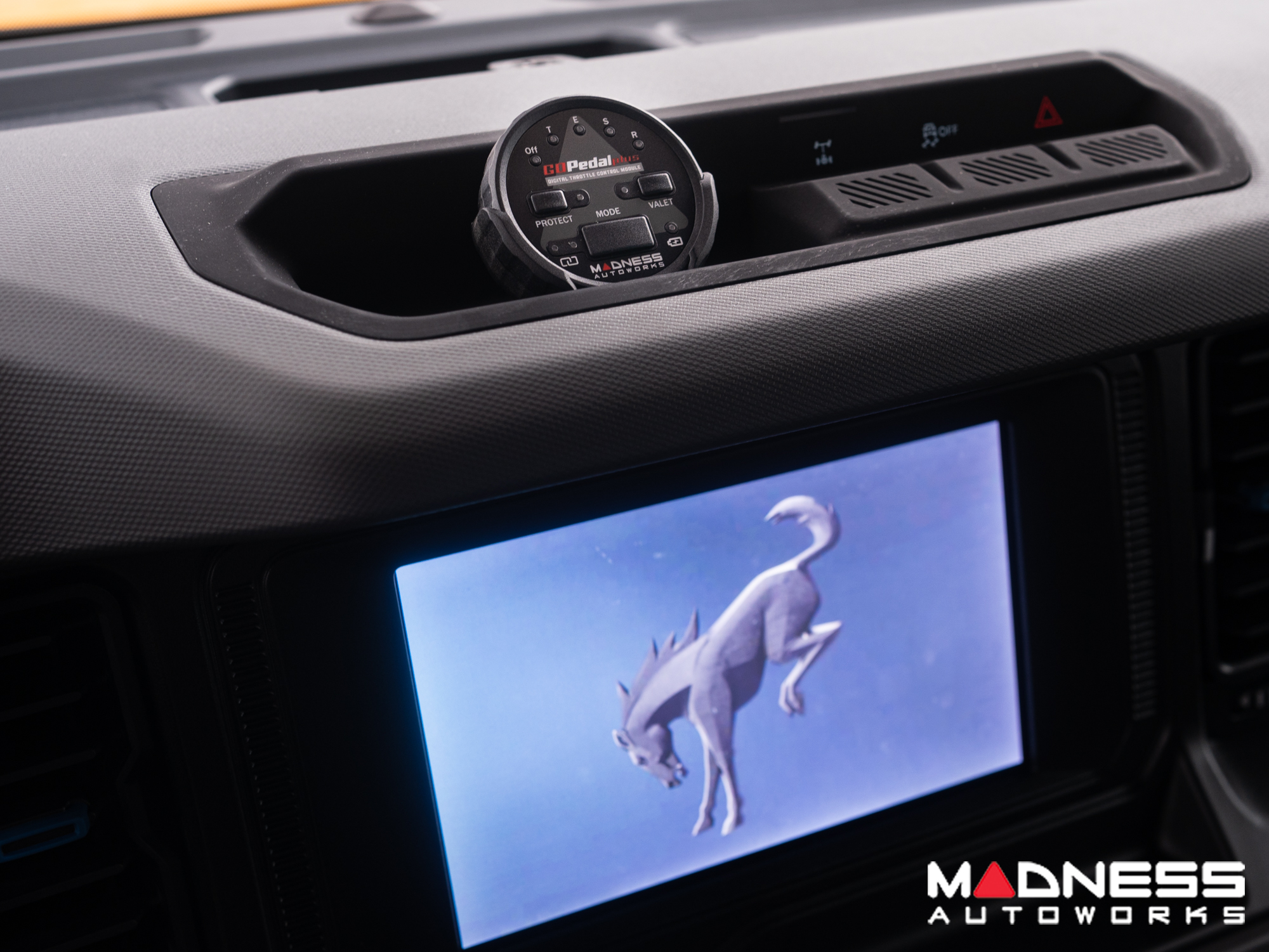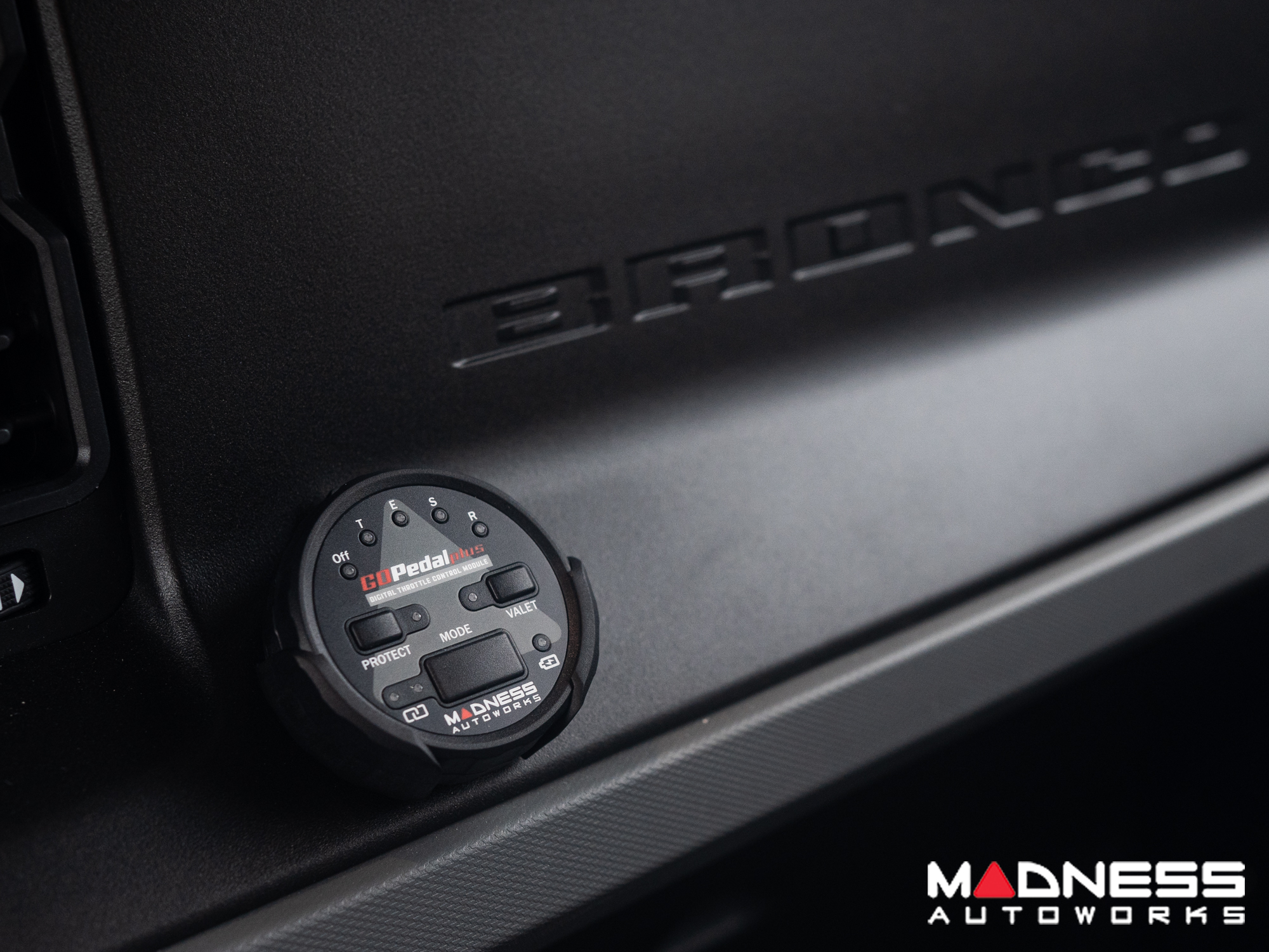 Enhance your off-roading experience with the all-new Madness GoPedal Plus. This plug-and-play device improves throttle response, eliminates pedal lag, and lets you customize your acceleration curve to match your driving style. Whether you're crawling over rocks or racing across the desert, the GoPedal Plus gives you better control and more power on demand. And it's designed specifically for the Ford Bronco, so installation is a breeze. You are in control! MADNESS Autoworks presents the future of plug in throttle pedal tuning. The new MADNESS GOPedal Plus! There are countless upgrades available for your Ford Bronco, why not start with something you can feel! Thousands of satisfied enthusiasts from all over the world have purchased and use the original MADNESS GOPedal. Now we are proud to introduce the next generation of Plug In Throttle Pedal Tuning. Our new Bluetooth Controlled MADNESS GOPedal Plus is here! As good as the original GOPedal is the new Plus version is even better! The original MADNESS GOPedal became one of the most popular and best reviewed product upgrades and continues to be a very popular upgrade. The new MADNESS GOPedal Plus takes all the things our fellow drivers loved about the original up a notch! The MADNESS GOPedal Plus is designed to reduce initial lag felt in todays drive by wire vehicles like the Ford Bronco by allowing you to advance your throttle’s timing to give you a more direct response for a much improved feel. Regardless whether your Ford Bronco is Manual or Automatic, 4cyl or 6cyl this quick and easy to install upgrade will make a BIG improvement in how your Bronco responds! Easily control your MADNESS GOPedal Plus with the handy wireless remote control or with your smart phone using our GOPedal Plus App. Easily view the status of your