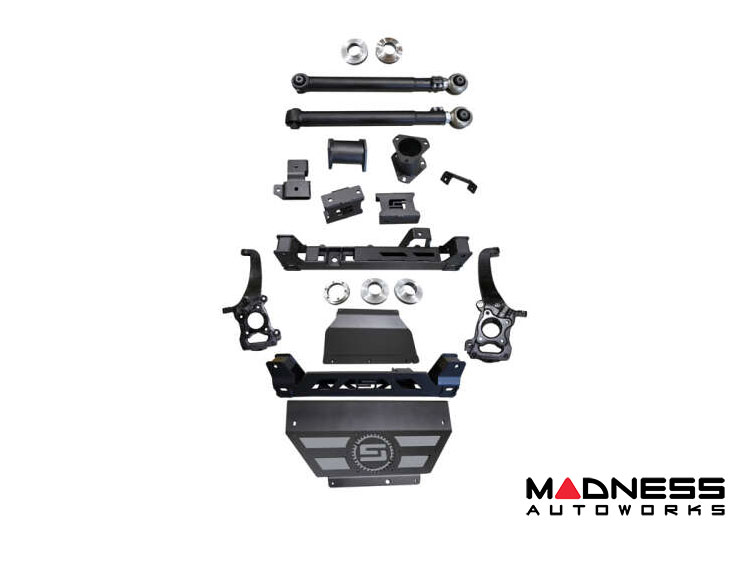 This kit features CNC machined steering knuckles, HD 1/4” plate crossmembers, and a front skid plate with the Superlift “S” logo laser cut into the material for a modern look.