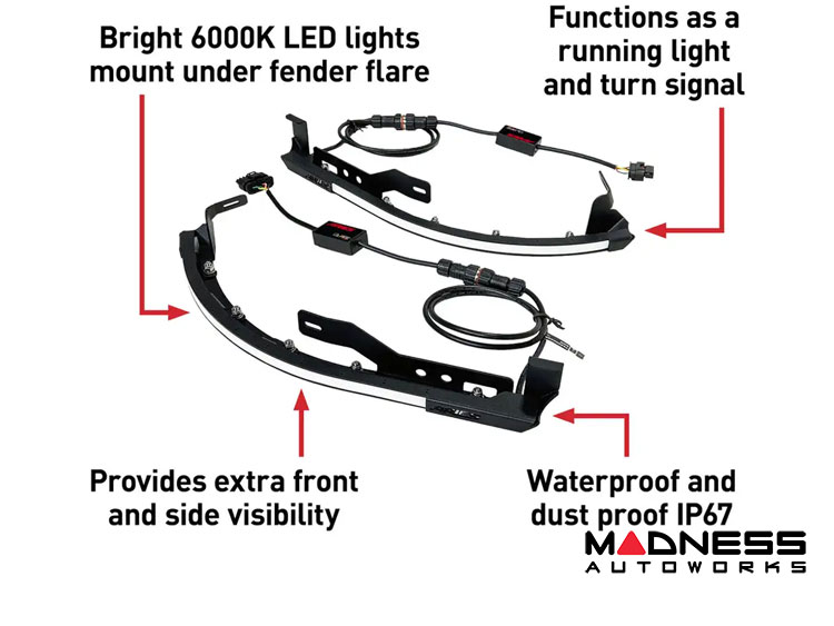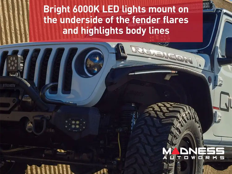 - Bright 6000K LED lights mount underside of fender flare and highlight body lines